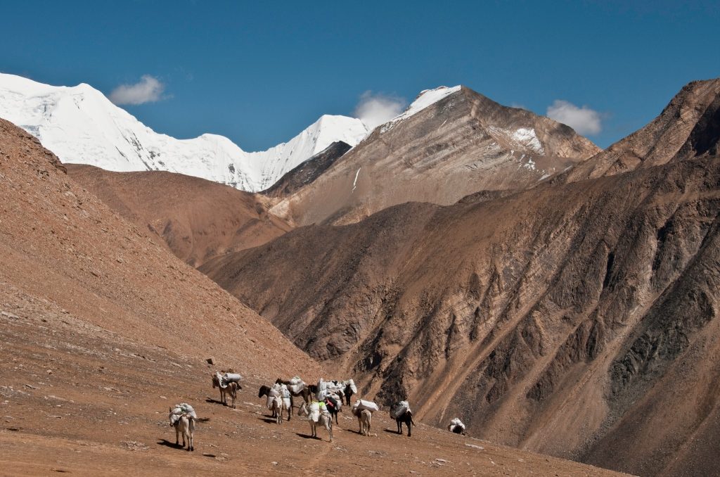 The trek becomes a little more challenging today as you leave the riverbed and follow the ancient trails along the western slopes of the valley. There is hardly a level step today as you always seem to be climbing or descenting a ridge or gully slope. The landscape to the east is dominated by the giant gorge that cuts a gash through the solid rock of the lower valley. You trek through arid land that barely supports hardy goat herds of the few tiny villages you pass though. Eventually you will summit the main ridge and high point of 3,540m before slowly descending towards the welcome sight of Geling sitting high above its terraced fields stretching down the foothill slope.
